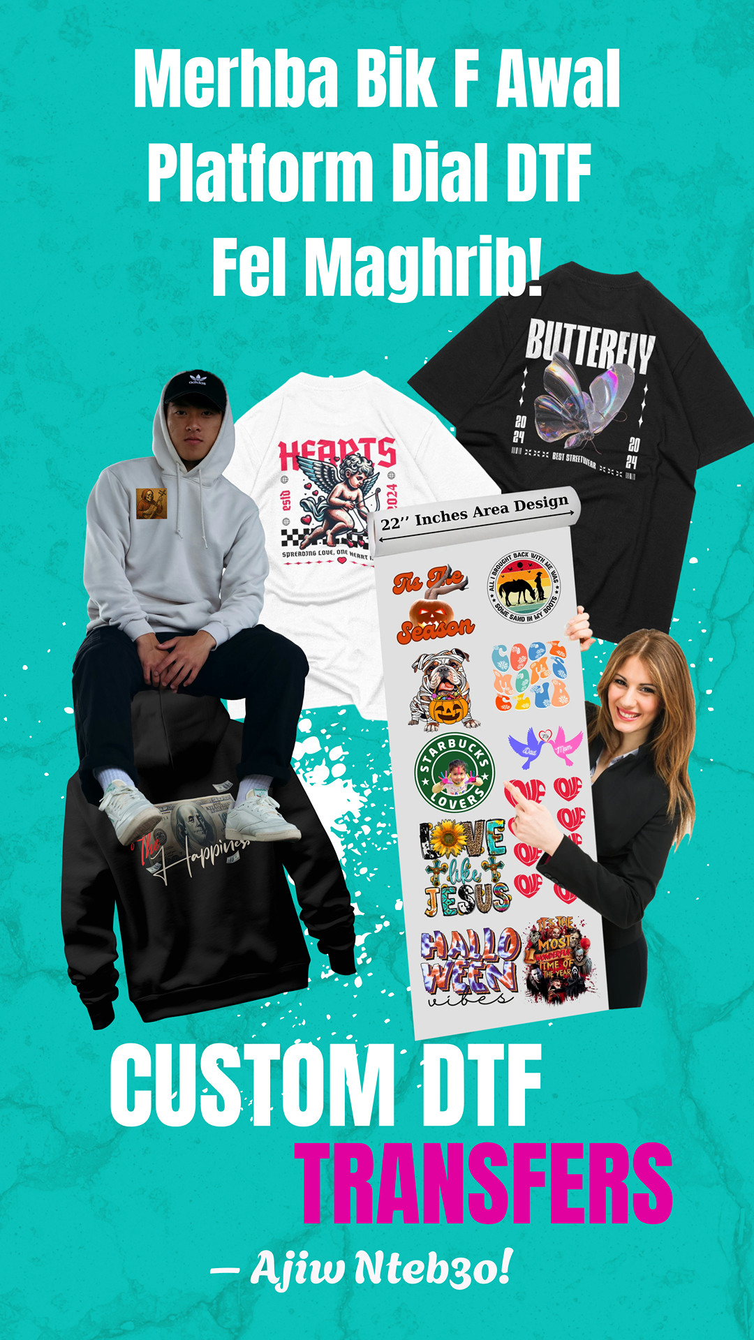 Based f Casablanca, We’re proud to be Morocco’s #1 DTF printing provider — delivering pro-quality prints, unbeatable speed, and top-notch service. Objective dialna nsahlou 3lik tdesigni w tcommandi rouleaux dial DTF customized b logo dyalek online. Kanwejdo l command dialek w nsiftoh lik f 9al mn 48 sa3a.